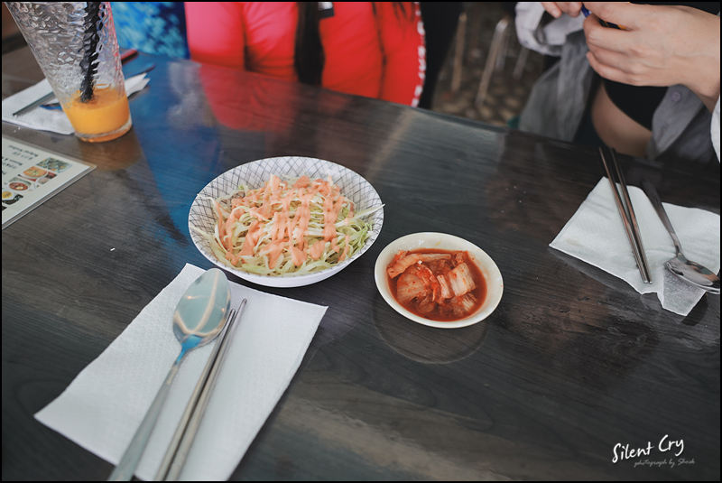 밑반찬으로 김치와 양배추샐러드가 나온다.