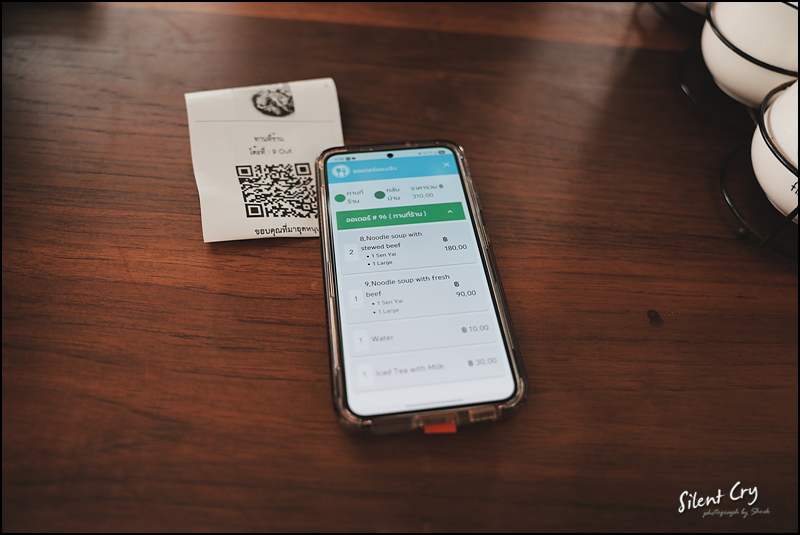 테이블에 앉으면 QR종이를 주고 스마트폰으로 주문을 한다. 8번 2개 9번 1개 (라지사이즈) 물과 타이티 한잔 시키니 310바트 나옴